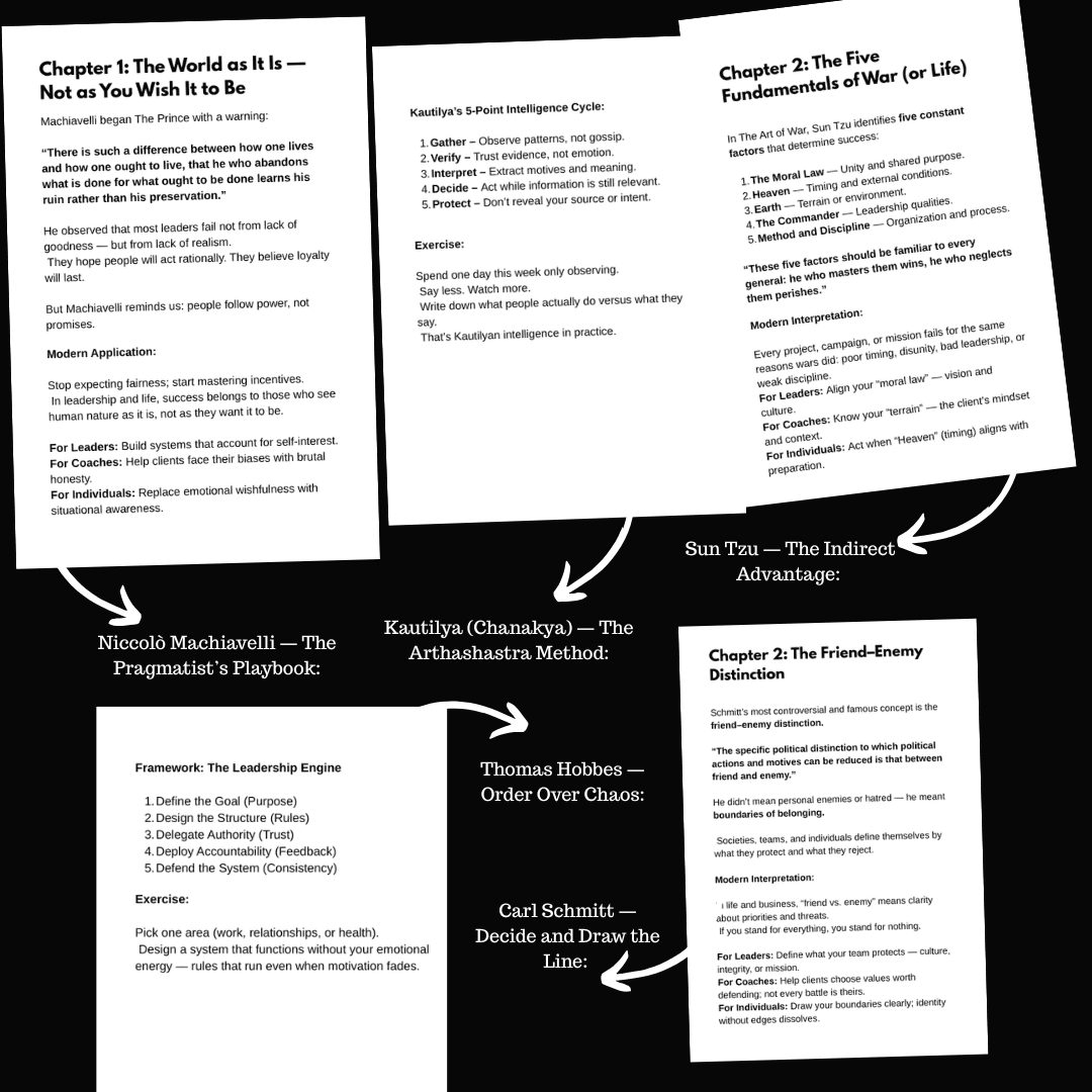 Together, they form a unified curriculum — a modern school of strategic thinking, emotional intelligence, and ethical realism.